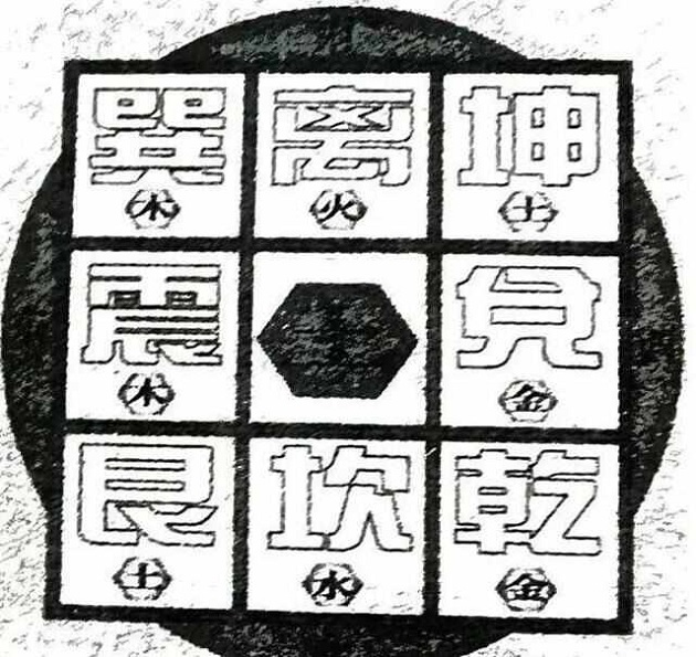 八卦所属:乾、兑(金);震,巽(木);坤,艮(土);离(火);坎(水)。