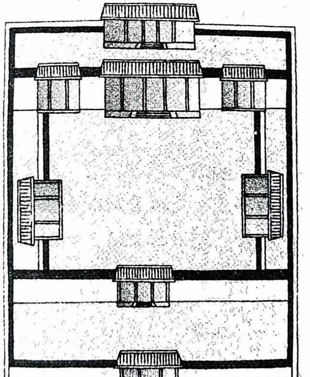 主屋分别被两侧房屋所夹,呈“工”字形。住在这种形状的住宅中的人容易患脚疾,女性则容易难产、受伤或生病。