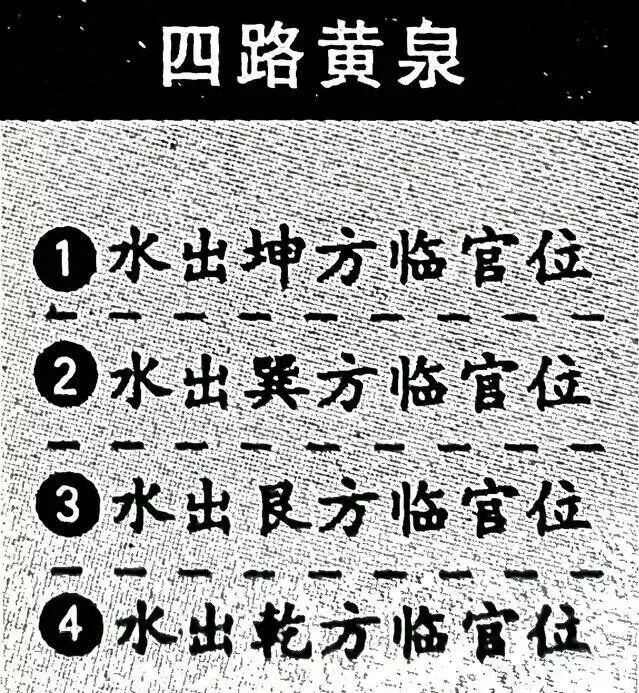 四路黄泉是指坐甲山庚向、癸山丁向,坤方来水是黄泉;巽方来水是黄泉;艮方来水是黄泉;乾方来水是黄泉。